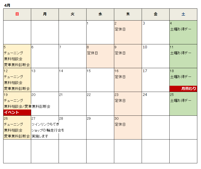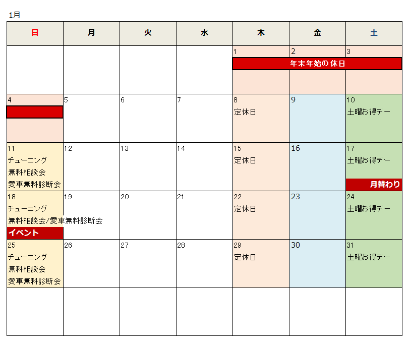 弊社営業カレンダーとなります。営業の予定以外にも、各種イベントやキャンペーン等のお知らせも随時掲載しております。