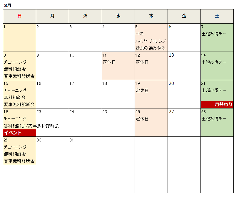 - 弊社からお得なお知らせチューニング無料相談会・愛車無料診断会 毎週日曜日はチューニング無料相談会・愛車無料診断会を実施中です!!チューニングトラブルのお悩み相談から、お客様が気になるチューニングパーツについてアドバイス、お車の現状を把握、分析 […]