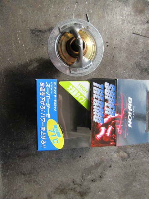 色々調べてみた結果、サーモスタット異常と判断、早速取り外しヒートガンで温めてみても開きません。サーモ下っと異常なので交換決定、元々ローテンプサーモが入っていたので同等品にて対応、交換終了後水温は安定しました。超アナログなーもスタットにも寿命はありますね。今回追加メータのありがたみを感じましたね。